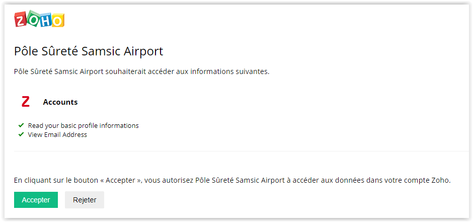 Vous devez ensuite accepter l'accès à votre compte Zoho.